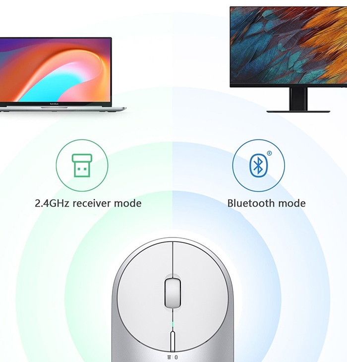 Беспроводная мышка Xiaomi Mi Portable Mouse 2 оснащена чипом Bluetooth и USB-приемнику 2,4 Ггц, мышка может подключаться к компьютеру любым удобным для Вас способом. Кроме того, удобный переключатель на основании мыши позволяет быстро переключаться между разными компьютерами.