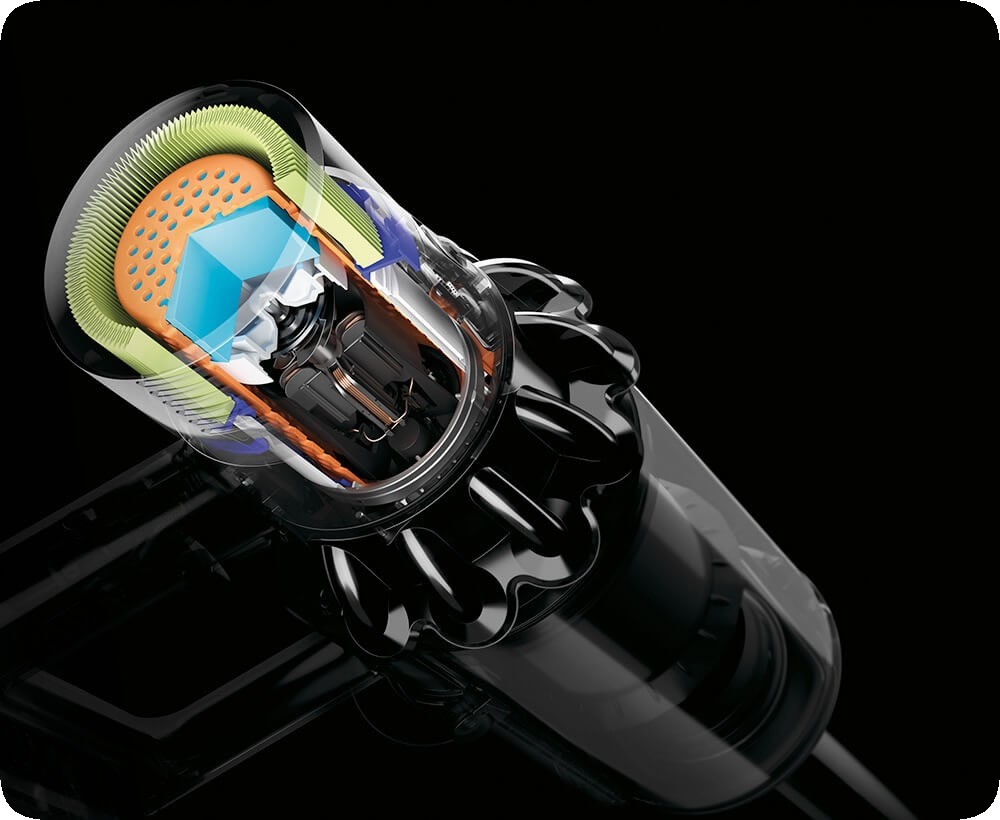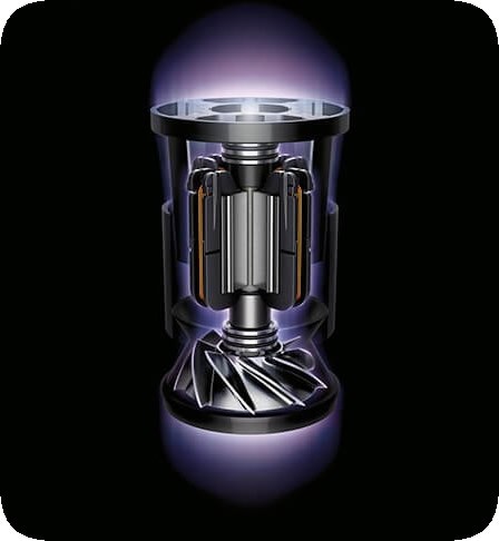 Самый компактный, самый легкий и самый мощный двигатель для пылесоса из когда-либо созданных Dyson. Керамический вал двигателя спекается при температуре 1600°C, что делает его в 3 раза более прочным и в 2 раза более легким, чем сталь. Благодаря тому, что импеллер перемещен из передней части двигателя в заднюю, поток холодного воздуха, проходя вдоль оси двигателя, снижает его температуру, что позволило увеличить скорость вращения до 125 000 об/мин. Вырабатывает мощность всасывания полноразмерного пылесоса.