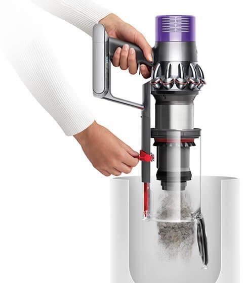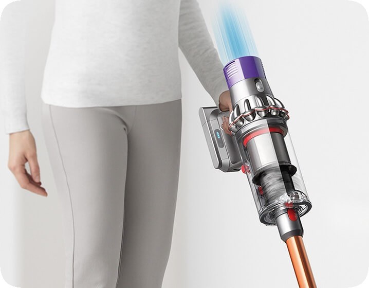 Благодаря тому, что двигатель, контейнер и циклоны расположены на одной линии, воздух проходит из насадки в циклоны по прямой траектории. В сочетании с более мощным двигателем Dyson V10 с цифровым управлением, это позволило увеличить мощность всасывания.