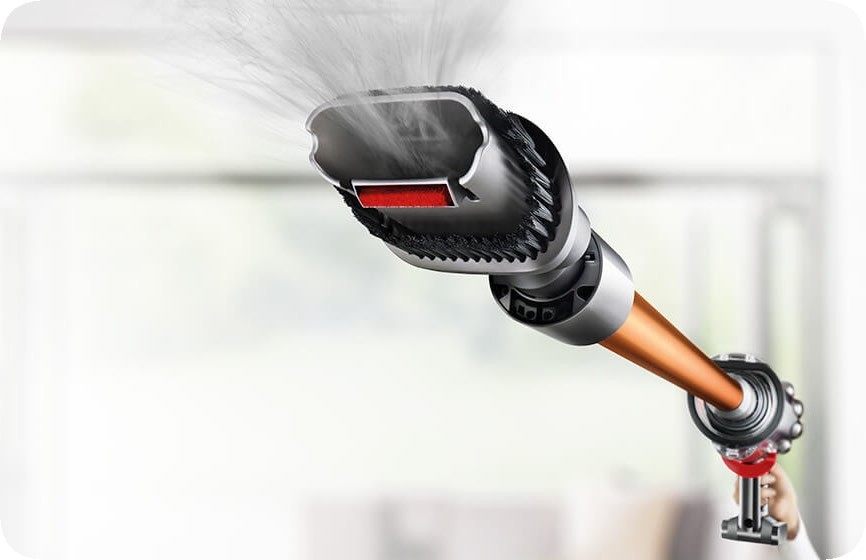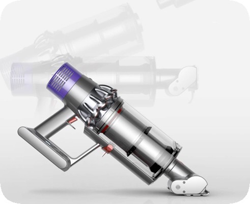 Двигатель пылесоса Dyson Cyclone V10 размещен над рукояткой, поэтому центр тяжести находится близко к руке, что облегчает уборку высоко расположенных поверхностей и труднодоступных мест.