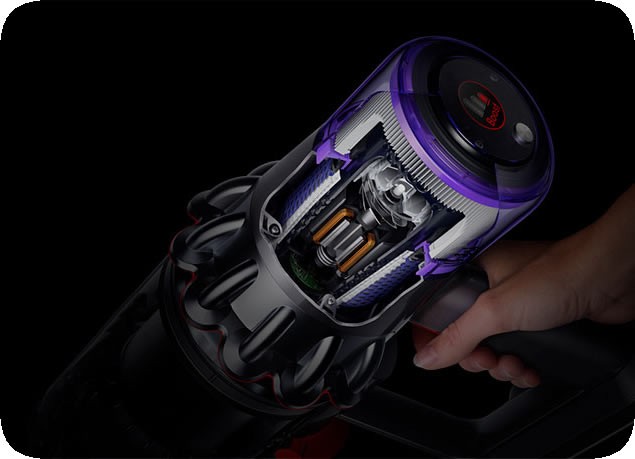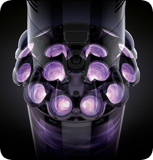 Циклоны генерируют силу 79 000 g, что позволяет пылесосу затягивать 99,97% микроскопических частиц размером до 0,3 микрона, таких как пыльца и даже бактерии. Мелкая пыль остается в контейнере, не попадая в фильтр, что позволяет пылесосу не терять мощность всасывания.