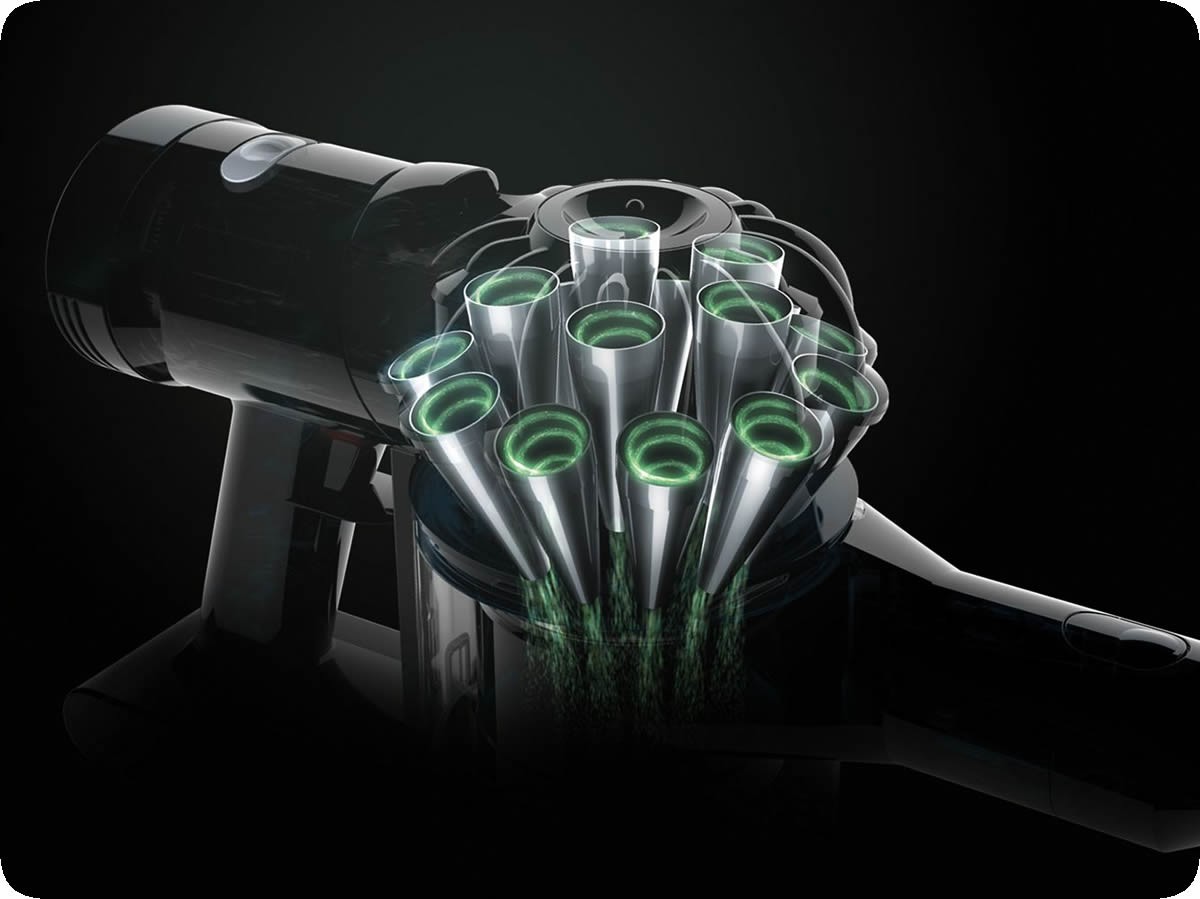В беспроводных пылесосах Dyson использована запатентованная циклонная технология 2 Tier Radial, которая позволяет задерживать даже микроскопические частицы пыли. 15 циклонов расположены в два ряда и работают параллельно для усиления воздушного потока и улавливания мелкой пыли. Эта запатентованная циклонная технология в сочетании с цифровым электродвигателем Dyson и усовершенствованной никель-кобальтовой марганцевой батареей обеспечивает постоянную высокую мощность всасывания.