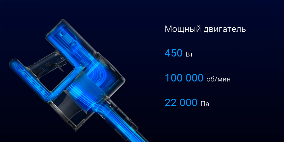 Встроенный двигатель имеет мощность 450 Вт. Скорость его работы достигает 100000 об/мин, что обеспечивает эффективное всасывание под давлением 22000 Па.