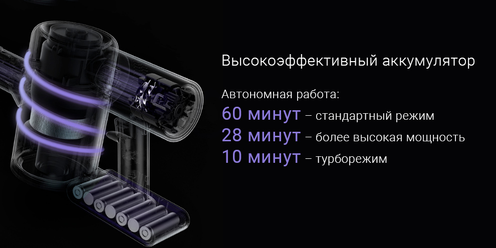 Благодаря емкому аккумулятору пылесос может проработать около 60 минут в стандартном режиме, 28 минут – при более высокой мощности и 10 минут в турборежиме.