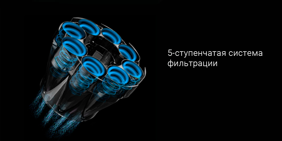 Фильтрационная система устройства включает в себя 5 элементов. НЕРА-фильтр устраняет мелкие частицы, размер которых около 0,3 мкм. Остальные фильтры удаляют пыль, отделяют крупные частицы и блокируют загрязняющие вещества.
