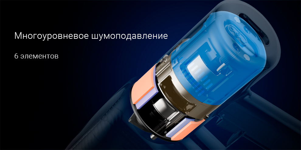 Снижение уровня шума во время работы пылесоса осуществляется с помощью 6-уровневой системы активного шумоподавления.
