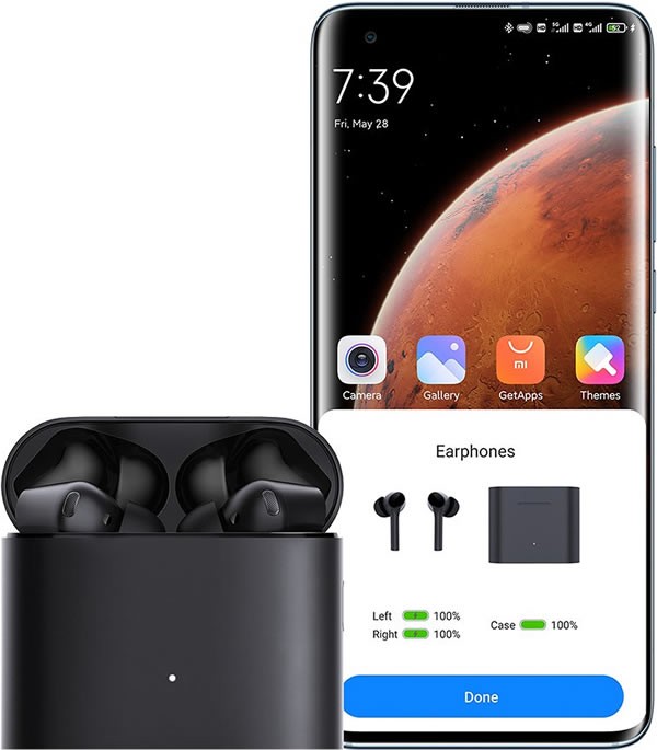 Для сопряжения Xiaomi Mi Air 2 Pro нужно лишь открыть футляр для зарядки рядом со смартфоном и коснуться экрана, когда на нем появится всплывающее окно MIUI. Затем извлеките наушники из футляра — смартфон распознает их и выполнит сопряжение. В дальнейшем наушники можно сразу надевать, а смартфон сам распознает их и проведет подключение. Что также удобно - со смартфона можно посмотреть заряд как у наушников, так и у самого кейса.