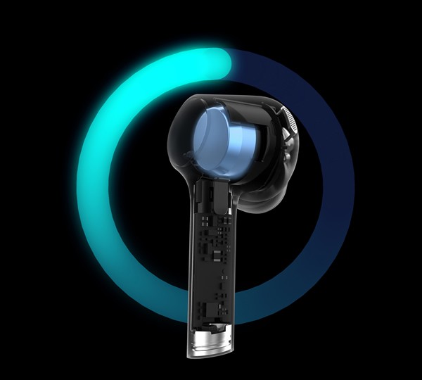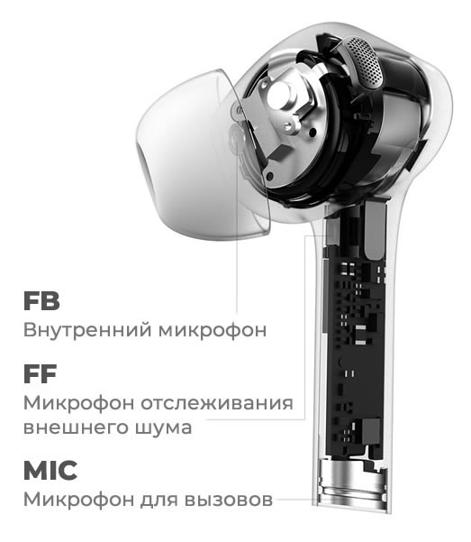 Для шумоподавления используются два микрофона — один отслеживает внешний шум, а второй обрабатывает их перед тем, как пустить в ухо. Такая система позволяет достичь эффективности гибридного шумоподавления до 35 дБ. Уникальный большой резонатор справится и с высокочастотным шумом (1000–3000 Гц), например криком, звуками стройки или громким грохотом.
