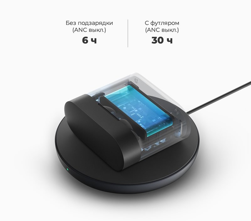 Чип нового поколения является более энергоэффективным, что позволит вам слушать музыку на протяжении более длительного периода времени. Без подзарядки аккумулятора хватит на 6 часов использования, а с футляром для зарядки вы получите до 30 часов прослушивания.