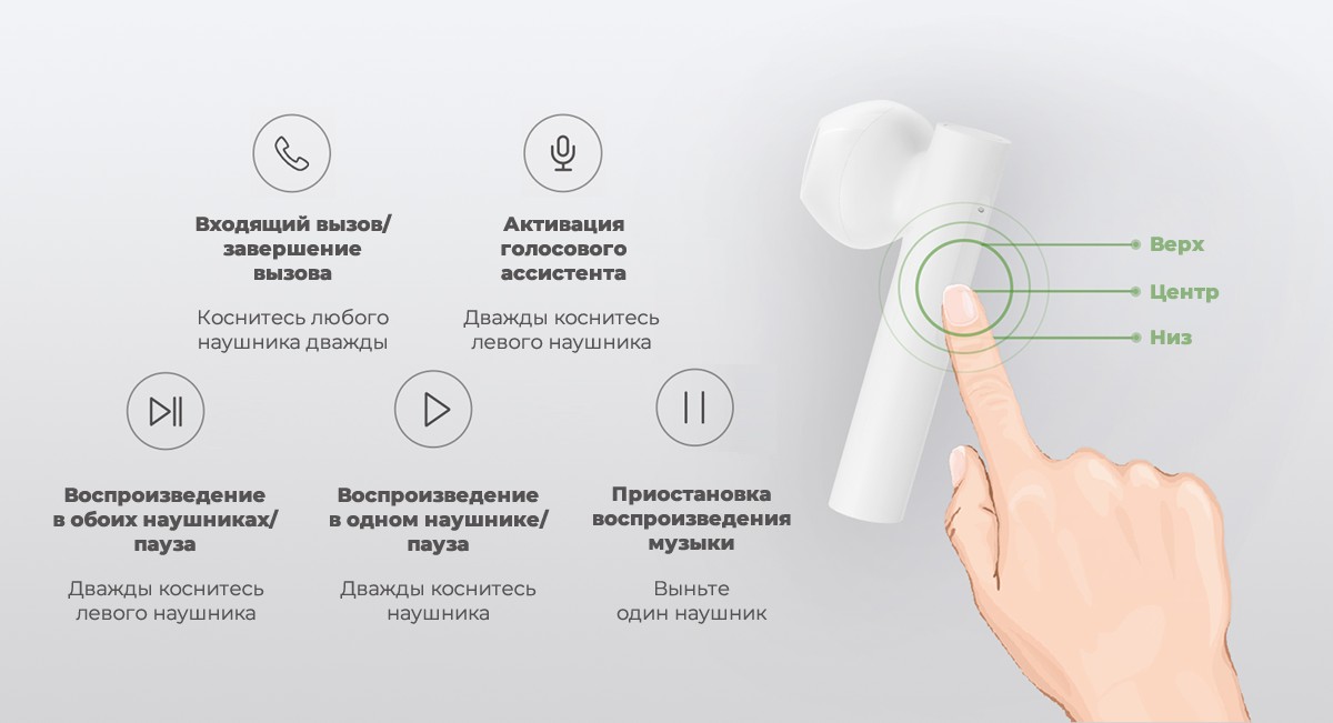Управляйте звонками и воспроизведением музыки легким прикосновением. Беспроводные наушники Xiaomi Mi True Wireless Earphones 2 Basic отлично понимают жесты. Поддерживается голосовое управление. Рядом возможностей, включая паузу/воспроизведение музыки, ответ/завершение вызова и активацию голосового ассистента можно воспользоваться, дважды коснувшись наушников. Легко управляйте функциями, не доставая смартфон.