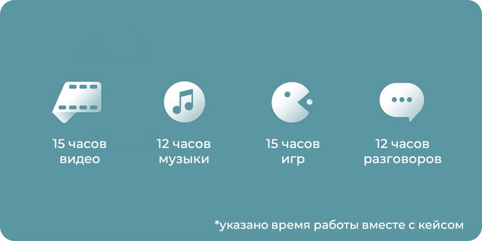 Каждый наушник получил собственную аккумуляторную батарею, поддерживающую хорошее звучание 4 часа. Аккумулятор в кейсе позволяет увеличить продолжительность работы до 12 часов.