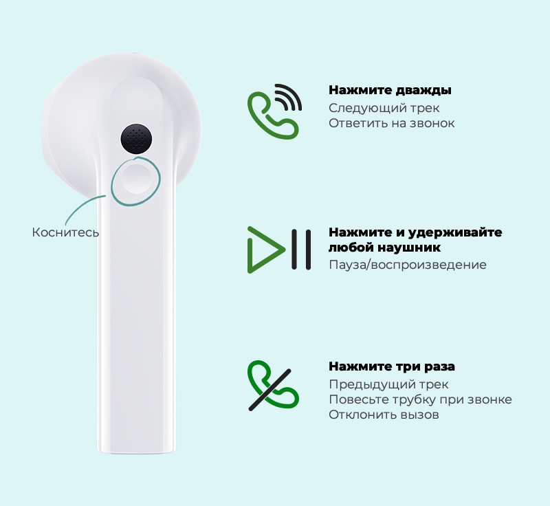 Коснитесь задней части наушников, чтобы переключать режимы, приостанавливать и возобновлять воспроизведение музыки и многое другое.