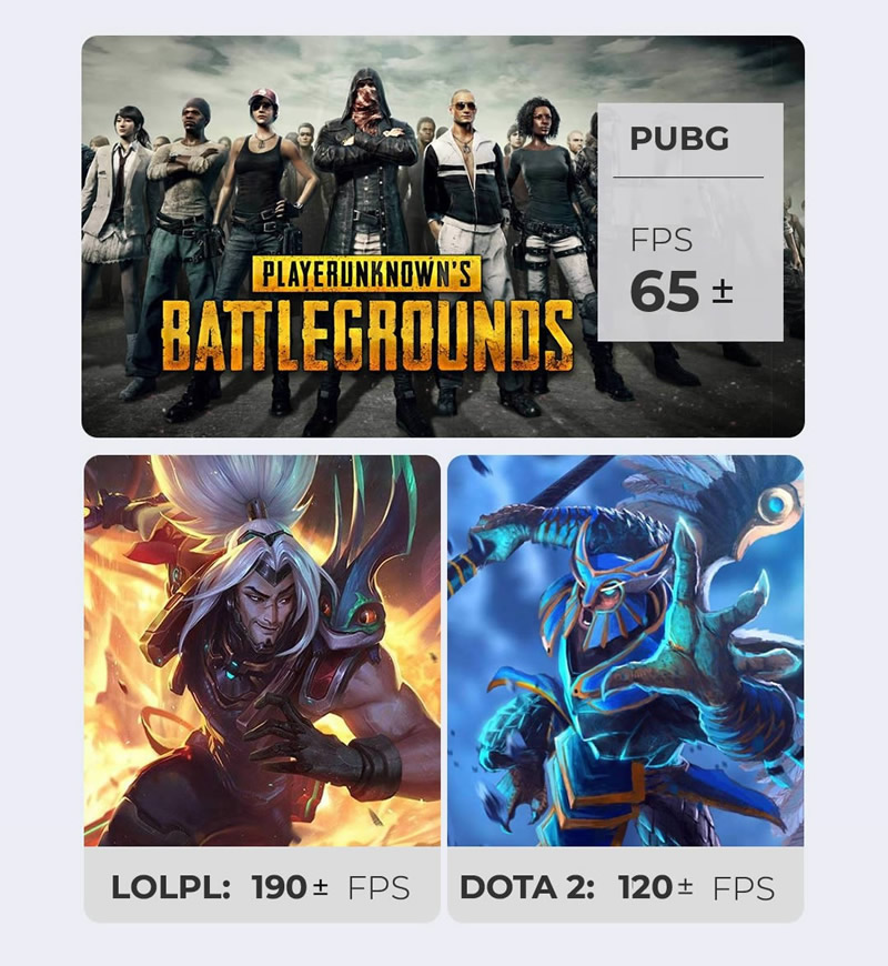 Мощная видеокарта NVIDIA GeForce GTX1650. Показатели в играх достигают: в PUBG до 65 fps, в Dota 2 до 120 fps, в League of Legends Pro League до 190 fps.