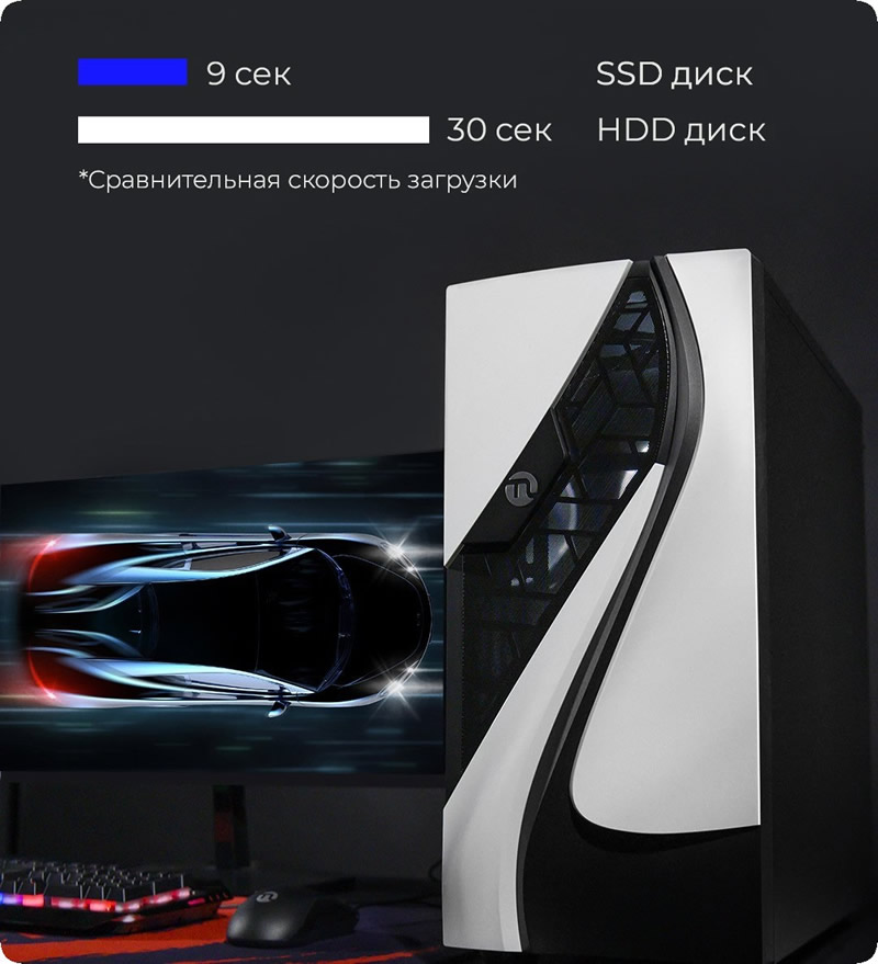 Быстрая реакция твердотельного диска SSD - игры, открытие документов и приложений. Время загрузки компьютера составляет всего лишь 9 секунд по сравнению с 30 секундами загрузки на жестком диске HDD.