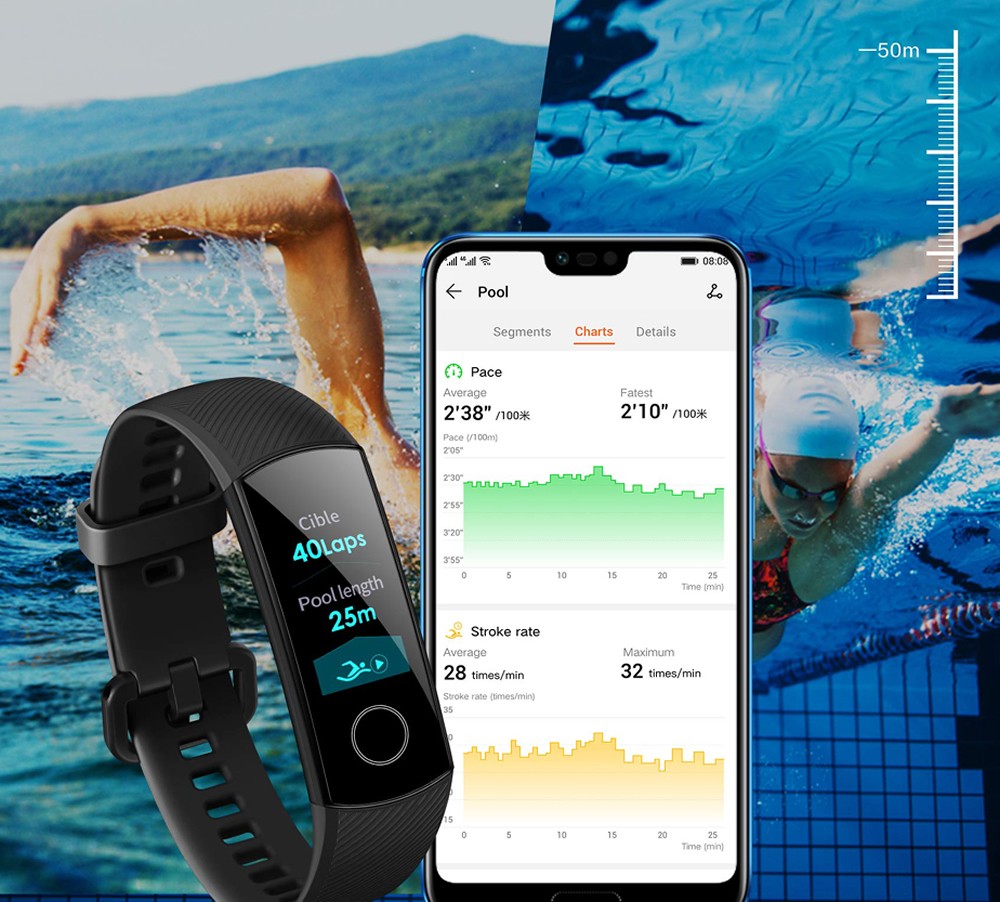Смарт-браслет может автоматически распознавать стили плавания, записывать скорость плавания, расстояние, калории и определить средний SWOLF.