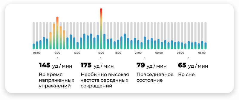 Встроенный биосенсор PPG измеряет частоту сердечных сокращений, отслеживая взлеты и падения во время тренировок и отдыха.