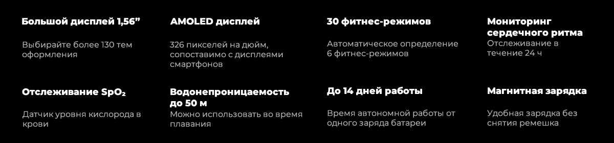 | Функции | пульсометр, контроль сердечного ритма, измерение давления, шагомер, счетчик калорий, отслеживание сна, отслеживание физической активности, отслеживание кислорода в крови, отслеживание уровня стресса, отслеживание менструального цикла, дыхательные упражнения, отображение погоды, будильник, таймер, SMS, уведомления о входящих звонках, уведомления из соцсетей, уведомления приложений, управление музыкой, удаленное управление камерой, поиск телефона, блокировка экрана, режим "не беспокоить" |