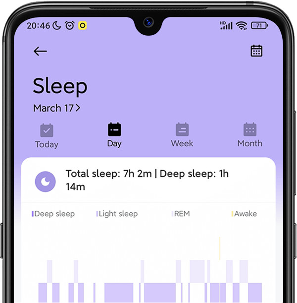 Xiaomi Mi Band 6 точно записывает продолжительность сна, фазы глубокого сна, легкого сна и быстрого сна на основе изменений частоты сердечных сокращений. Получите научные рекомендации, которые помогут вам выработать регулярные привычки сна.