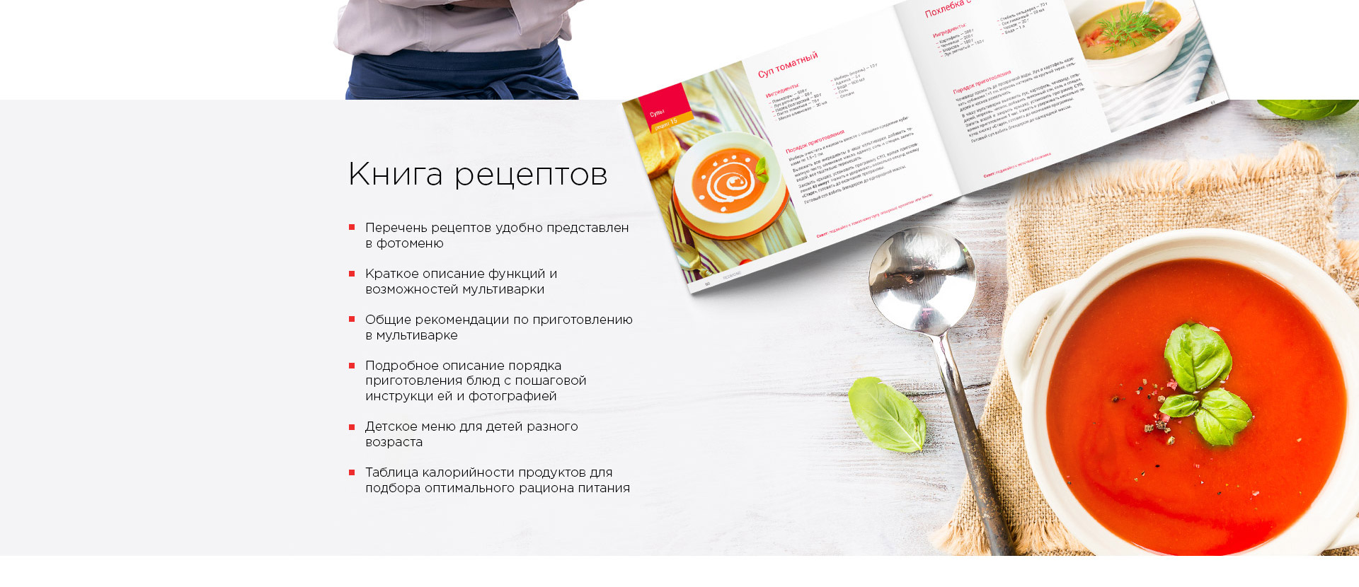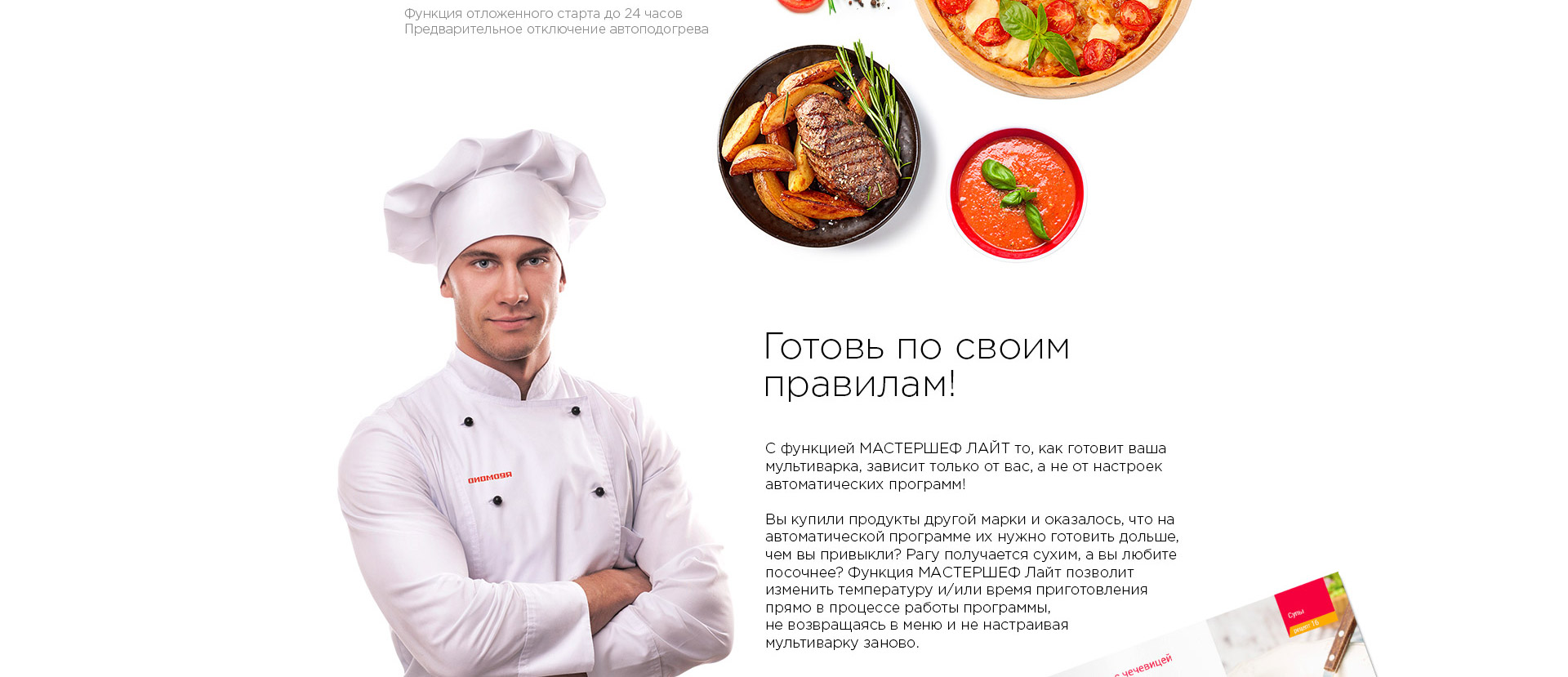 Приготовить в умной мультиварке можно практически все: супы и гарниры, вторые блюда и блюда на пару, хлеб и выпечку, десерты, детское питание и натуральные йогурты. Используйте универсальную программу МУЛЬТИПОВАР, чтобы готовить блюда по сложным рецептам, а также по французской технологии sous-vide (в вакууме), при которой в продуктах сохраняется максимум питательных веществ и витаминов. МУЛЬТИПОВАР позволяет задавать свои настройки времени и температуры до начала приготовления.