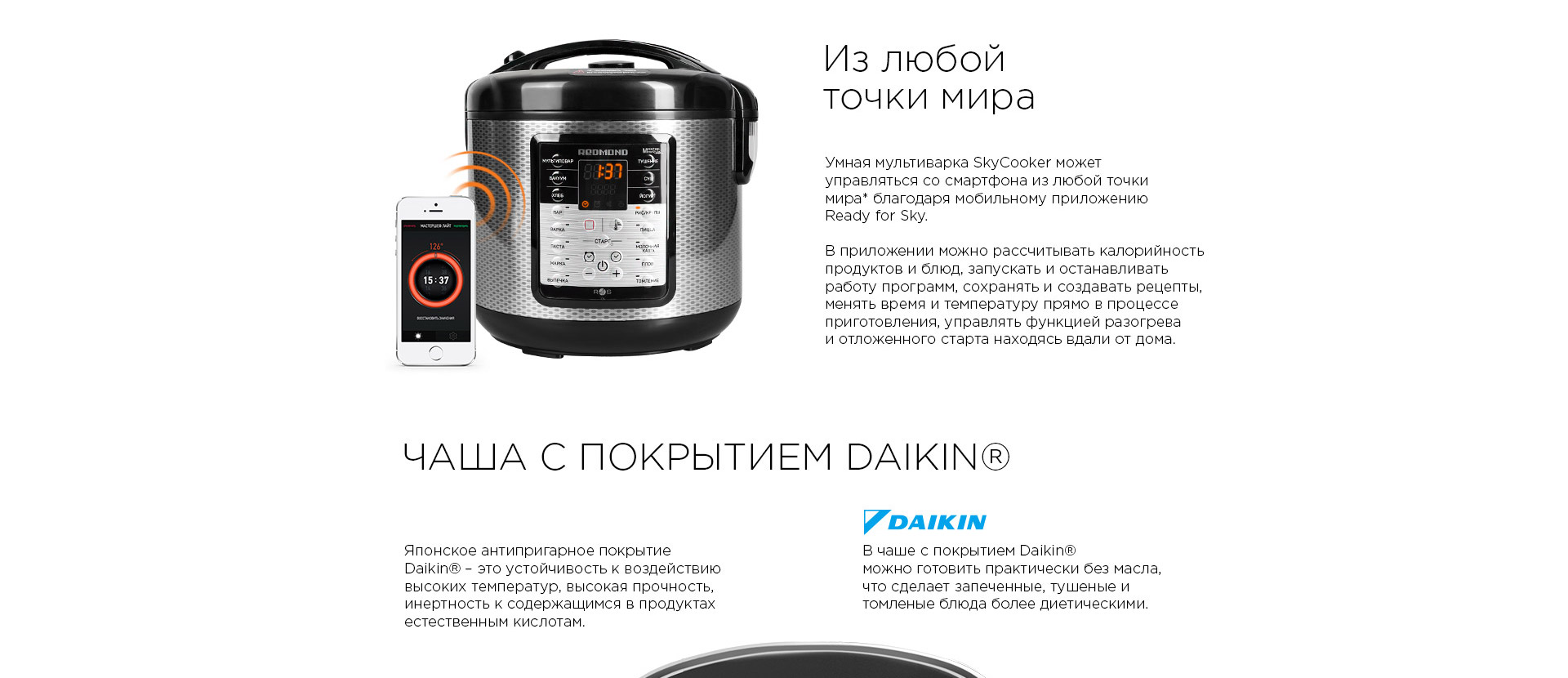 Мультиварка REDMOND SkyCooker RMC-M42S – умная мультиварка с баночками для йогурта и контейнером для приготовления на пару в комплекте. Готовить в SkyCooker можно не только с панели управления, но и дистанционно со смартфона. Доступ ко всем настройкам мультиварки вы получаете через приложение Ready for Sky.