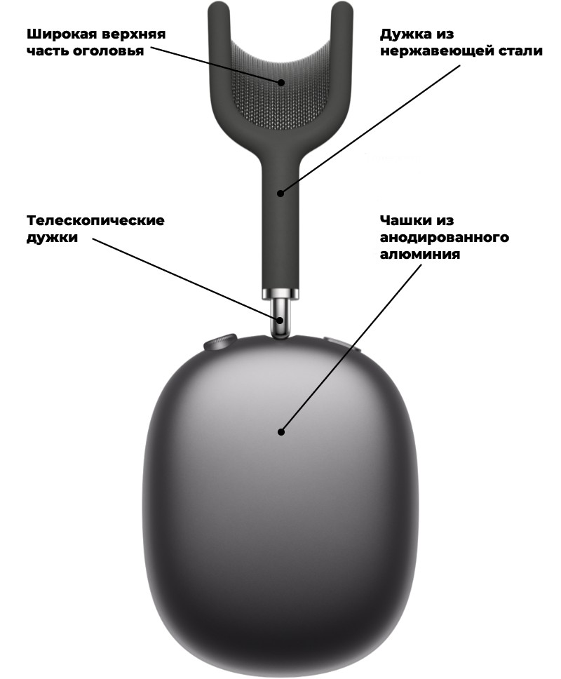 AirPods Max — это совершенно новый взгляд на полноразмерные наушники. Все элементы AirPods Max, от амбушюров до оголовья, спроектированы таким образом, чтобы наушники оптимально прилегали к голове любой формы. Благодаря этому достигается невероятное качество и богатство звука.