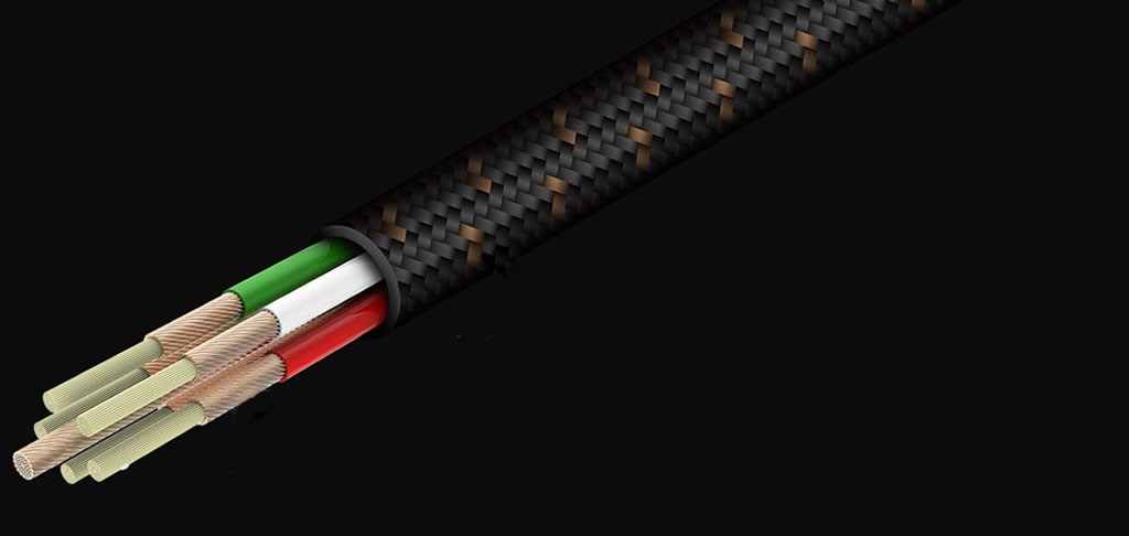 Провода кабеля состоят из эмалированной бескислородной меди, оплетенной вокруг кевларового волокна. Это значительно повышает долговечность и прочность кабеля, предотвращая его растягивание и разрывы. Кабель покрыт эластичным плетённым материалом (ТРЕ), который обеспечивает мягкость, и защиту от «эффекта стетоскопа» - передачи шорохов и звуков трения к ушам. Вплетенный слой нейлона обеспечивает прочность и стойкость, а также не дает проводу запутываться.