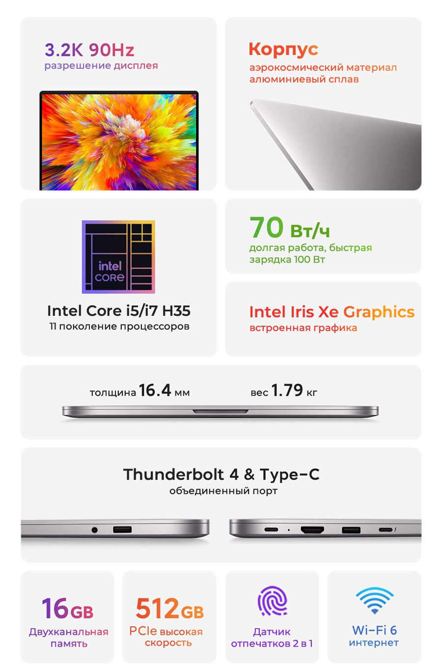 Все преимущества новой линейки собраны вместе. Процессоры Tiger Lake от Intel одиннадцатого поколения Core i5 11320H и Core i7 11390H (в зависимости от версии), видеокарта NVIDIA GeForce MX450 2Gb GDDR5 (или встроенная графика Intel Iris Xe Graphics), высокая скорость передачи данных c Wi-Fi 6. Дисплей с разрешением 3.2К (3200 x 2000 пикселей), мощный аккумулятор 70 Вт/ч. Корпус из алюминиевого сплава, интерфейс Thunderbolt 4, встроенный в порт USB Type-C и это еще не все!