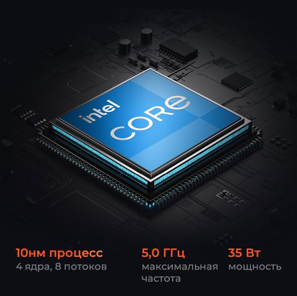 Выбирайте процессоры Intel Core нового 11-го поколения Core i5 11320H или Core i7 11390H, построенные на 10-нм процессе SuperFin. 4 ядра, 8 потоков, максимальная частота до 5,0 ГГц. Это скачок на новые рубежи.