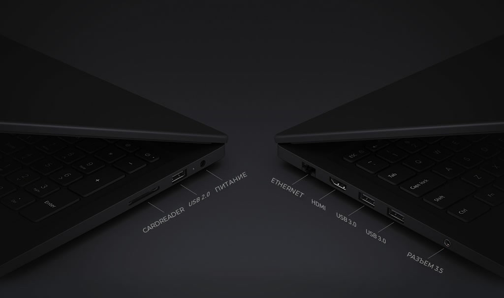 Xiaomi Mi Notebook 15.6" имеет совмещенный порт для карт памяти, USB 2.0, гигабитный Ethernet-порт, порт HDMI, 2 порта USB 3.0 и аудио-выход. Ноутбук можно без переходников подключить к проектору или аудиосистеме для максимальной мобильности.