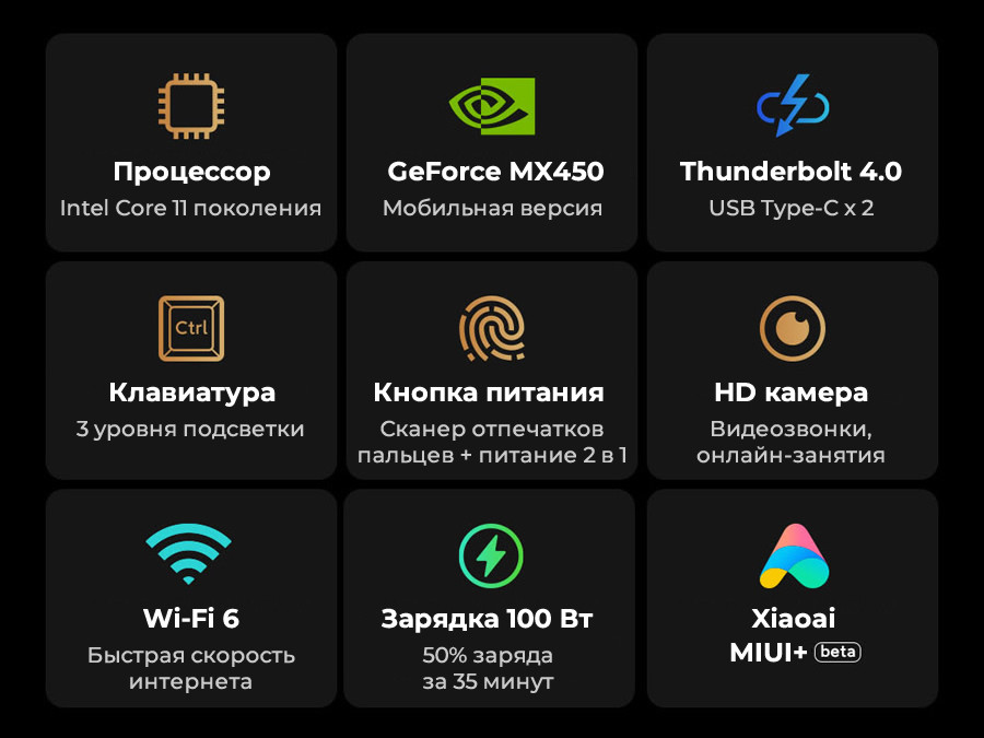 Емкий аккумулятор 66 Вт/ч обеспечивает до 13 часов просмотра видео от одного заряда, а быстрая зарядка с мощностью 100 Вт дает возможность пополнить энергию аккумулятора до 50% за 35 минут. Пользуйтесь ноутбуком без ограничений где бы вы ни были.