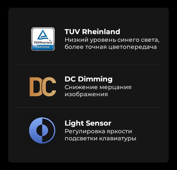 Дисплей имеет сертификацию TUV Rheinland от вредного воздействия синего свечения, а также поддерживает технологию DC Dimming, способствующую уменьшению мерцания изображения. Помимо этого ноутбук имеет автоматическую регулировку яркости подсветки клавиатуры, в зависимости от внешней освещенности.
