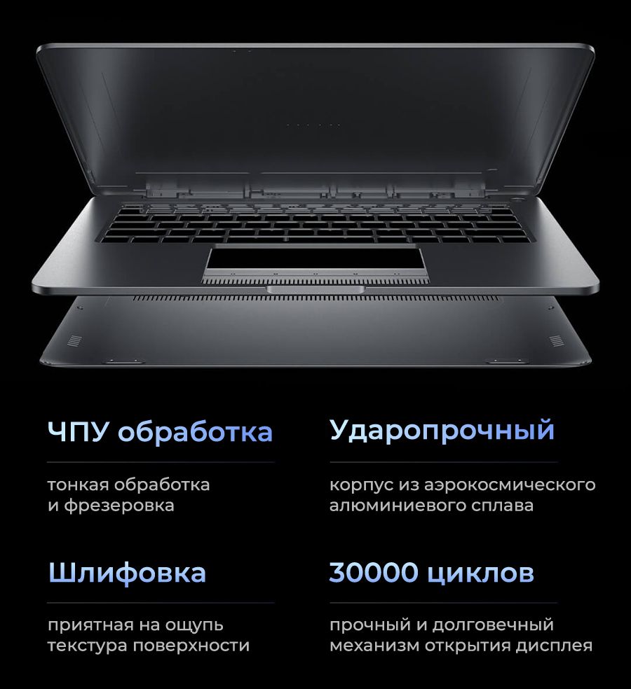 Для изготовления корпуса ноутбука был использован специальный материал из аэрокосмического алюминиевого сплава 6-й серии. Он в 1,4 раза прочнее, чем алюминиевый сплав 5-й серии. Каркас прошел обработку и тонкую фрезеровку на станках с ЧПУ, а также 17 этапов шлифования и доводки и имеет приятную на ощупь текстуру. При этом механизм открытия дисплея успешно прошел испытания и выдержал 30 000 циклов!