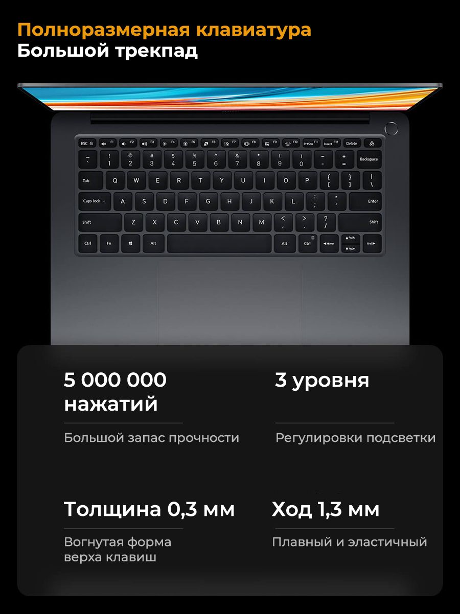 Полноразмерная клавиатура Xiaomi Mi Notebook Pro X 14 имеет встроенную автоматическую регулировку подсветки клавиатуры, в зависимости от внешней освещенности, и 3 уровня регулировки яркости подсветки. Широкие удобные кнопки с ходом 1,3 мм, толщиной верха 0,3 мм и большим запасом прочности в 5 000 000 нажатий. Большая сенсорная панель c поддержкой функций управления жестами. Набирайте текст быстро и удобно.