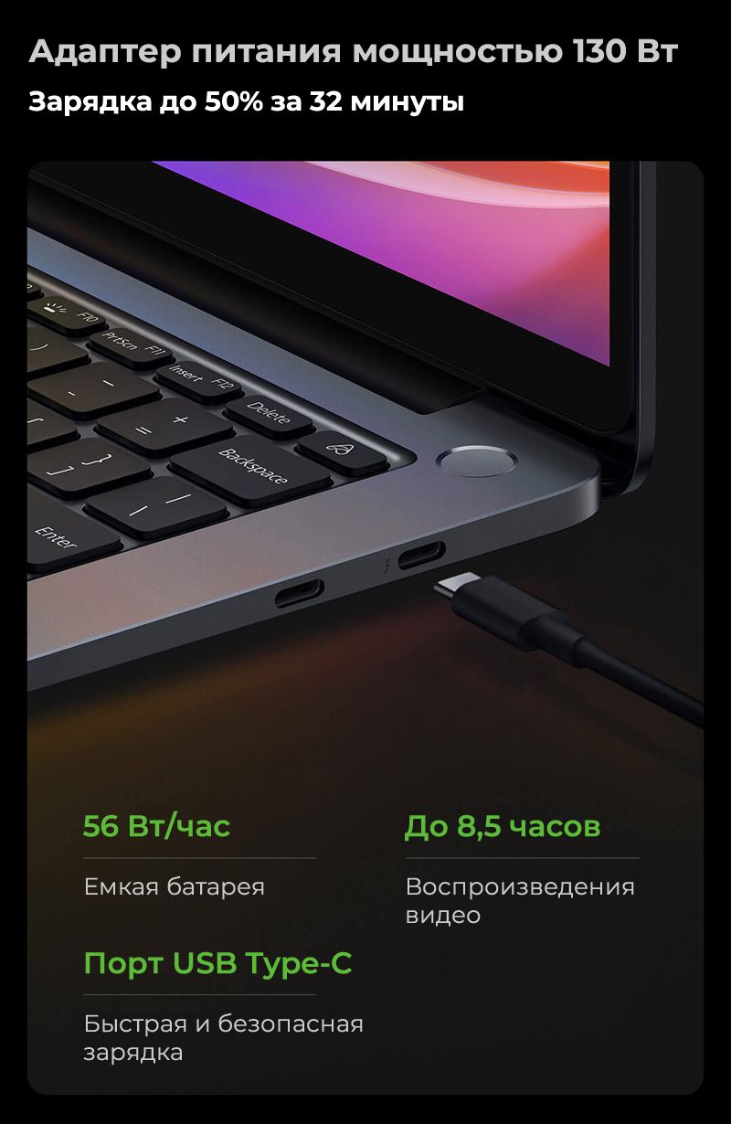 Емкий аккумулятор 56 Вт/ч обеспечивает до 8,5 часов просмотра видео от одного заряда, а быстрая зарядка с мощностью 130 Вт дает возможность пополнить энергию аккумулятора до 50% за 32 минуты. Пользуйтесь ноутбуком без ограничений где бы вы ни были.
