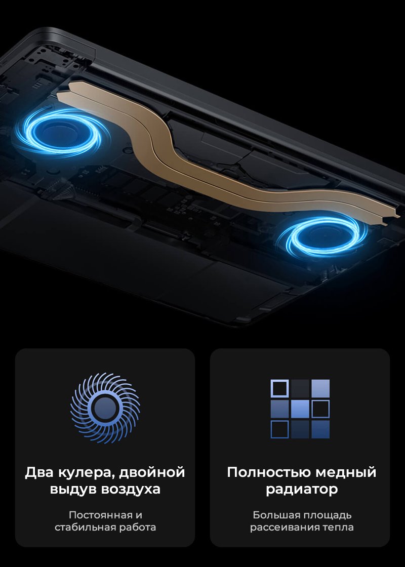 Ноутбук оборудован двойной теплоотводной трубкой-радиатором для эффективного и максимального отвода тепла полностью выполненной из меди и двумя мощными охлаждающими кулерами для его быстрого рассеивания.