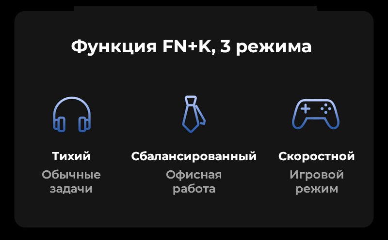 Ноутбук имеет три режима интеллектуального выбора производительности, в зависимости от поставленных задач, которые можно назначить с помощью комбинации клавиш FN и K (клавиша): "Тихий", "Сбалансированный" и "Скоростной", соответственно для обычных задач, офисной работы и игр.