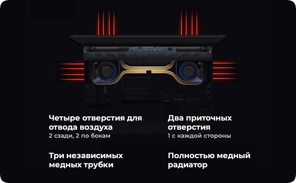 Два вентилятора, два боковых отверстия для забора воздуха, четыре отверстия для отвода воздуха, три независимых тепловых трубки, полностью медный радиатор и зигзагообразная компоновка элементов создают единую систему, способную быстро отводить большие объемы тепла и поддерживать наиболее оптимальную температуру компонентов в течение длительного времени, даже при большой нагрузке.