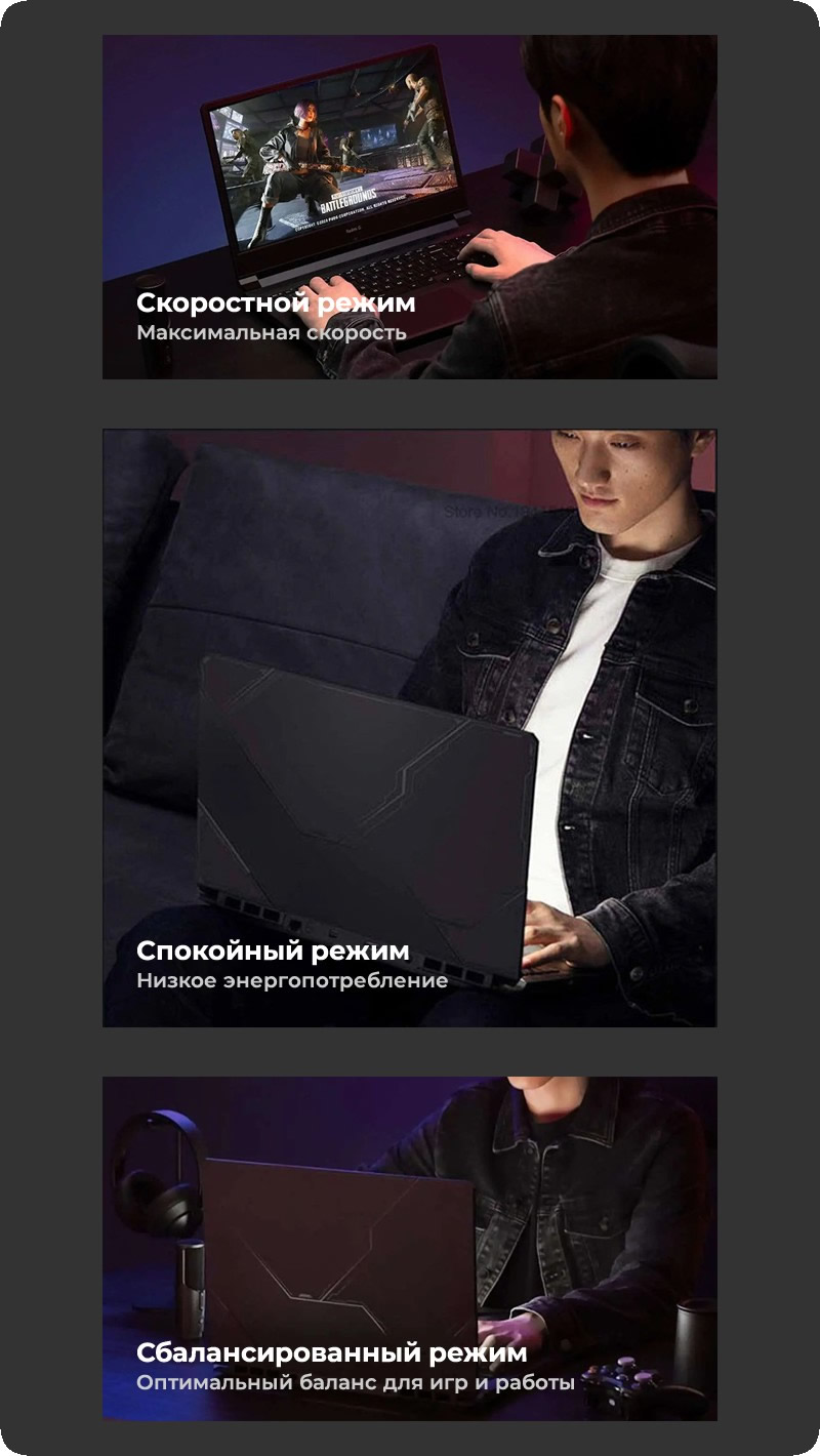 Redmi G имеет три режима производительности с быстрым переключением. С помощью сочетания клавиш Fn + K можно подобрать наилучшее решение для игр, музыки или нетребовательных задач с низким энергопотреблением.