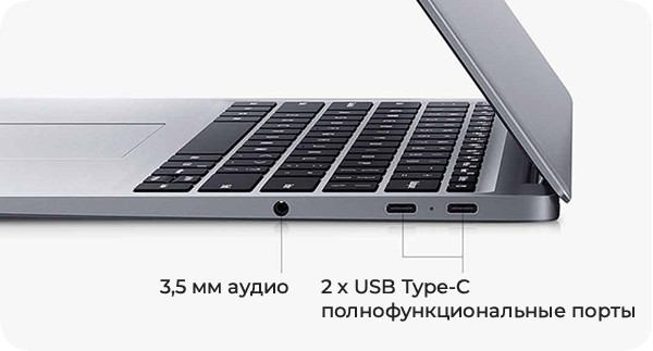 В RedmiBook Air 13" установлены 2 полнофункциональных порта USB Type-C. С ними вы можете заряжать ноутбук, передавать данные, использовать в качестве видеовыхода три в одном.