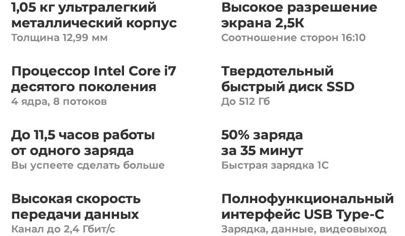С помощью легкого (около 100 грамм) и портативного мини-адаптера, с размерами 5 х 5 х 2,8 см, ноутбук можно зарядить через порт USB Type-C, который можно использовать и для зарядки смартфона.