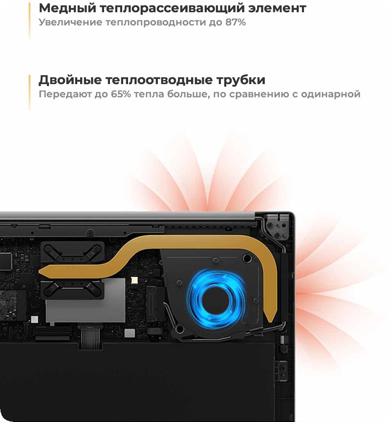 RedmiBood Air 13 оснащен кулером с системой двойного охлаждения. Вентилятор с особой формой лопастей и двойными теплоотводными трубками эффективно рассеивает тепло, снижая температуру нижней поверхности ноутбука.