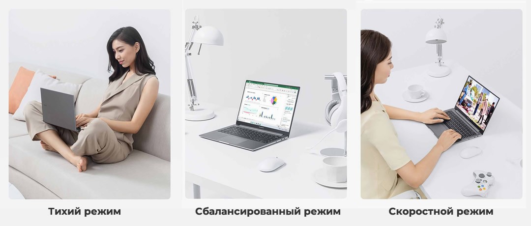 В ноутбуке можно назначить три умных режима работы системы с помощью комбинации клавиш FN и K (клавиша), в зависимости от поставленных задач: "Тихий", "Сбалансированный" и "Скоростной", соответственно для обычных задач, офисной работы и игр.