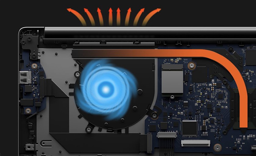 Система охлаждения из теплоотводящих трубок и кулеров эффективно отводит тепло от процессора и греющихся частей. Вентиляторы работают тихо и слышны только в турбо режиме.