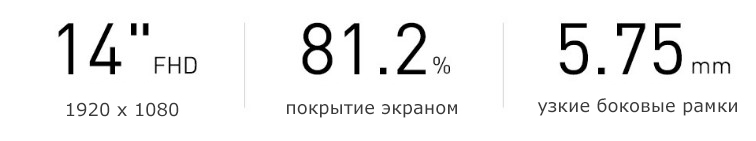 Дисплей с диагональю 14", яркостью до 250 нит и разрешением Full HD (1920×1080 пикселей), время автономной работы до 10 часов, система охлаждения, функция Smart Unlock 2.0, которая «пробуждает» ноутбук всего за 1.2 секунды и два динамика с поддержкой звука DTS.