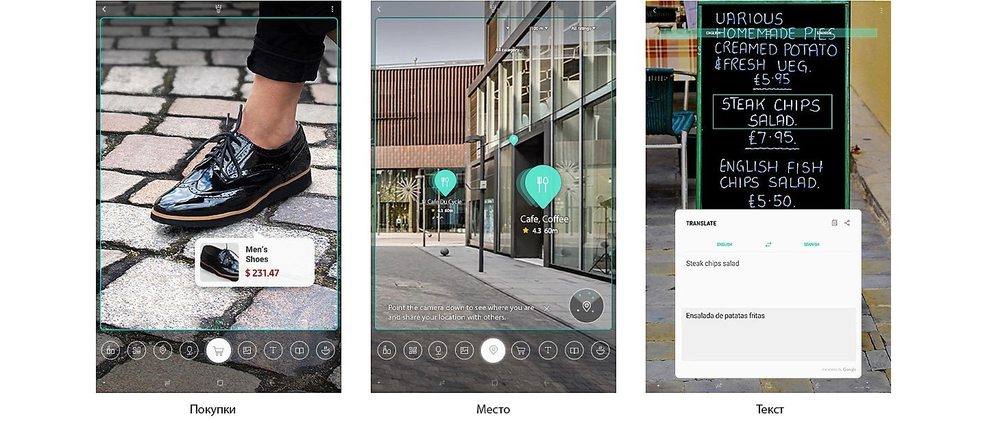 В Bixby Камера вы можете использовать функцию поиска Места поблизости для получения информации в реальном времени. С помощью иконки Bixby Камера в видоискателе камеры вы можете найти магазин, в котором продается товар, попавший в поле зрения камеры; кроме того, аналогичным образом можно найти место, где находится объект (дом, достопримечательность) и даже перевести с иностранного языка тексты информационных табло или блюда в меню ресторана.