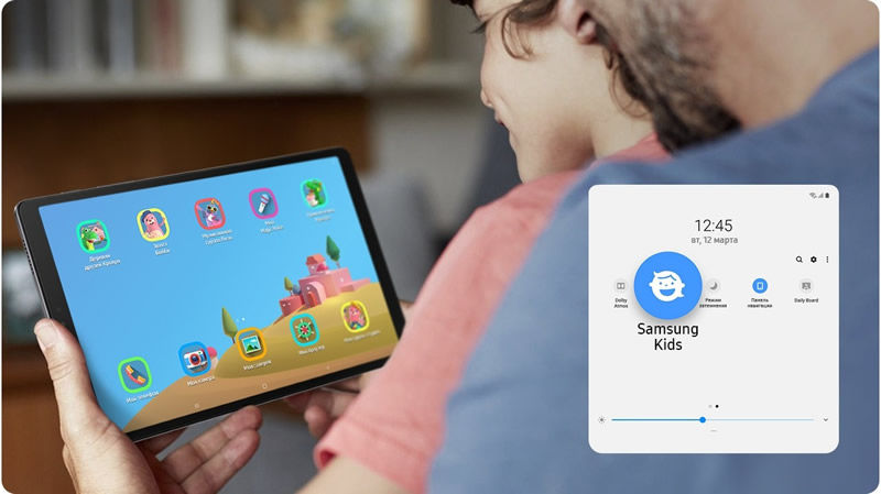 Детский режим Samsung Kids позволяет создавать безопасную среду для ваших детей. Просто нажмите на иконку детского режима на панели быстрого доступа и наслаждайтесь приложениями с персонажами, которые живут в виртуальном мире. Функция родительского контроля позволяет контролировать использование планшета и игровое время, поэтому вы спокойно можете передавать устройство детям.