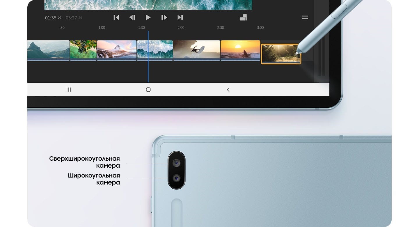 Создание качественных снимков на планшете больше не будет непосильной задачей. Ведь на борту у Galaxy Tab S6 находится двойная камера на 13 и 5 Мп. Первая за счёт чувствительного сенсора поможет вести съёмку даже при нехватке освещения, а вторая, широкоугольная, позволит снять детализированные панорамы.