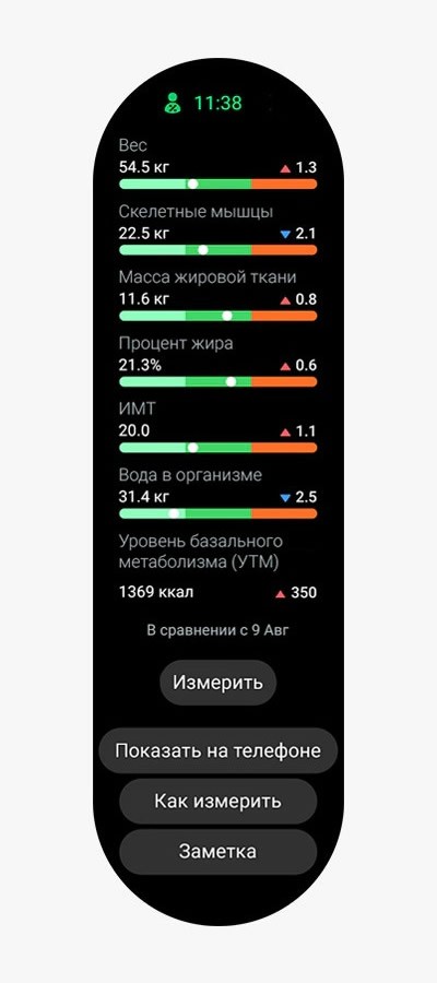 Получите результат биоимпедансного анализа (БИА) тела всего лишь за 15 секунд. В любое время и в любом месте. Новый датчик Samsung BioActive способен определить состав вашего тела в режиме реального времени, что позволит вам отслеживать динамику на пути к своей цели.