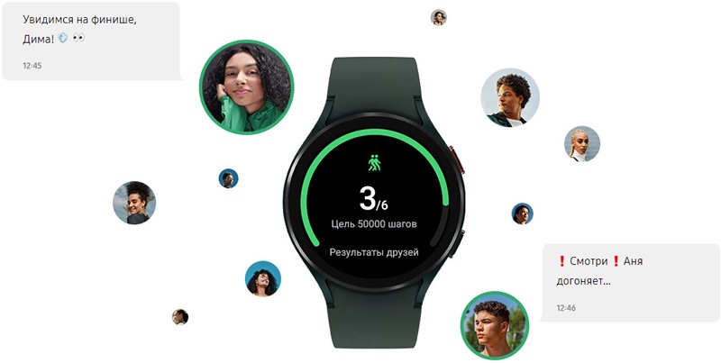 Наслаждайтесь своим прогрессом вместе с друзьями и семьёй при помощи Galaxy Watch4. Отслеживайте количество пройденных шагов и сравнивайте с результатом друзей в режиме реального времени. Получайте памятные значки и баллы в "Групповых соревнованиях" - сделайте свои тренировки более интересными, мотивирующими и интерактивными.