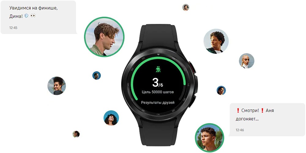 Наслаждайтесь своим прогрессом вместе с друзьями и семьёй при помощи Galaxy Watch4 Classic. Отслеживайте количество пройденных шагов и сравнивайте с результатом друзей в режиме реального времени. Получайте памятные значки и баллы в "Групповых соревнованиях" - сделайте свои тренировки более интересными, мотивирующими и интерактивными.